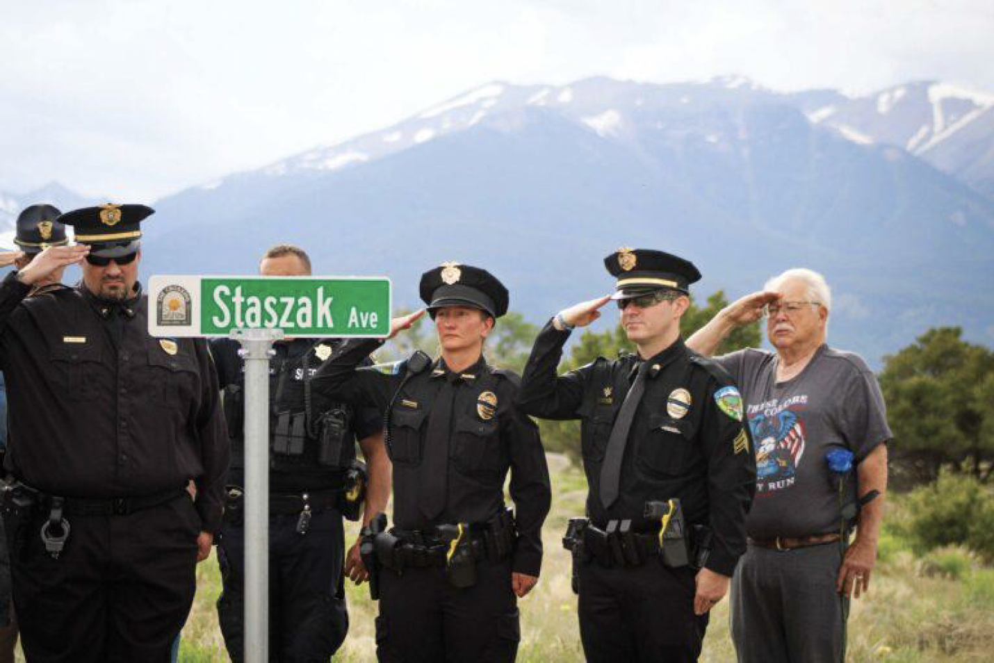 Current and former Buena Vista police officers honoring Officer Staszak at a groundbreaking ceremony.