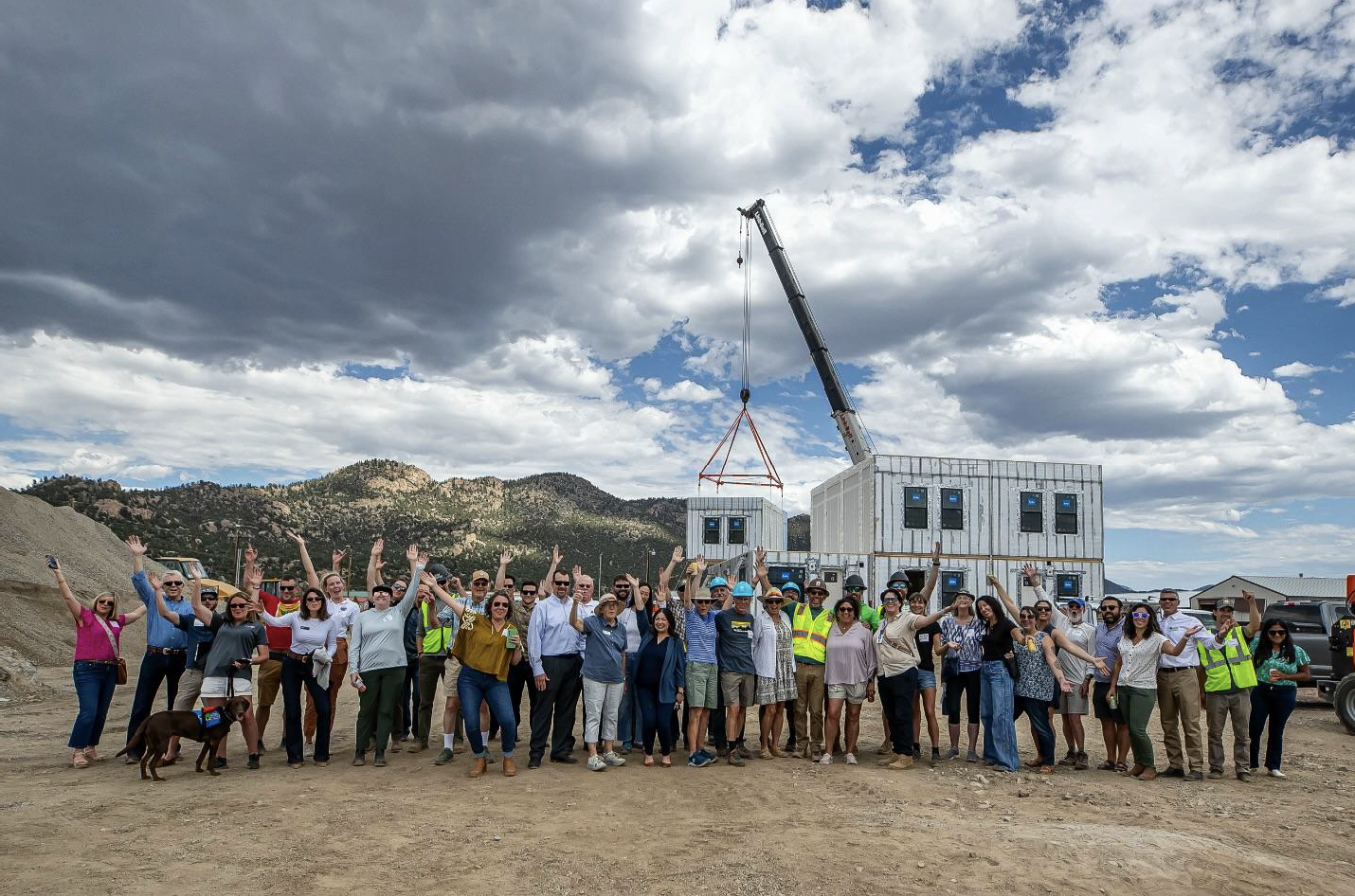 The Crossing team and supporters celebrating the “box setting” of the first Chaffee Housing Trust homes.